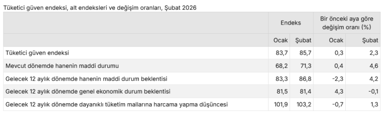 TÜİK ve Merkez Bankası işbirliğiyle yürütülen anket sonuçlarına göre, tüketici güven endeksi Şubat ayında 85,7’ye yükseldi.